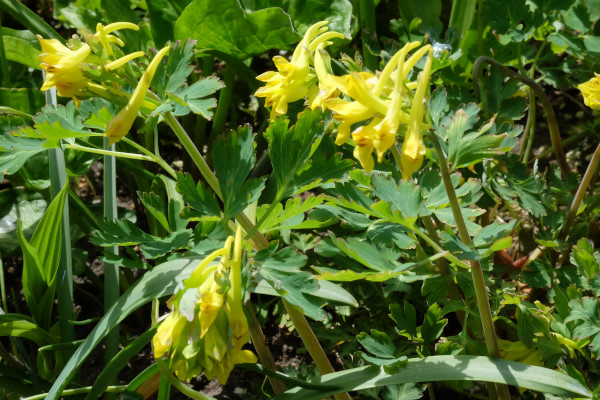 Hier kommen jetzt drei Lerchenspornme gleichzeitig in Blüte, im Schatten, alle drei auf kaum einen Meter verteilt.
