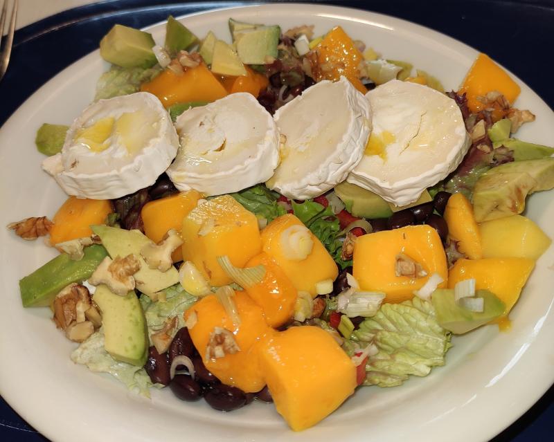 Gestern war es bei uns bewölkt, aber noch warm - daher gab es mittags einen Ziegenkäse-Salat mit Mango, Avocado, Paprika und schwarze Bohnen auf Lollo rosso/Lollo bianco-Bett.