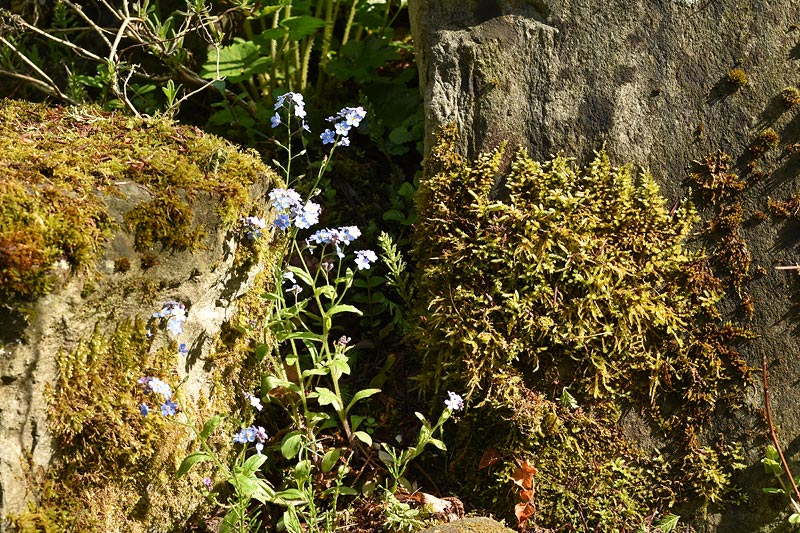 Das ist meine Staudenwiese, die sich einmal quer durch den Garten zieht, mittig durchbrochen von einem gepflasterten Weg bzw. im Querverlauf strukturiert durch die Mauer.