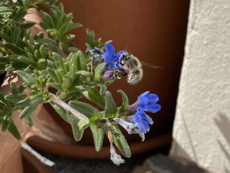 ein wildbienenbeweisfoto auf einem erst dieses frühjahr gekauften lithodora diffusa 'heavenly blue' hatte ich auch schon gezeigt, hier nochmal eins. wenn unsere neue minze blüht, schwirrt hoffentlich wieder der balkon. und mit nisthilfen erst recht! :D