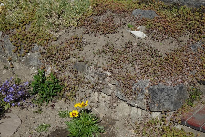 Im Vorgarten hab ich einen kleinen Hang der mit Sedum bewachsen ist. Dort jäte ich im zeitigen Frühjahr Unkraut und es entstehen Lücken, die von den Bienen besiedelt werden. Dem Flugverkehr in 2020 nach müssten in den Lücken auf dem Foto Hunderte Bienen nisten. Die Lücken sind mittlerweile wieder mehr oder weniger mit Sedum zugewachsen. Die Bienchen kommen schon raus und können dann ein paar Meter weiter die neuen Plätze besiedeln, die ich gerade vom Unkraut befreit habe. Auch auf den ebenen Flächen im Vorgarten nisten Bienen, sofern sich Lücken zwischen den Pflanzen auftun. In unserer Region gibt es nur ziemlich festen Lehmboden. Der scheint den Bienen zu gefallen