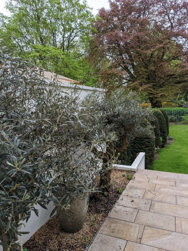 Meinen zweiten Olivenbaum an der Ostsee hatte ich aus demselben Grund gegen eine Hochterrasse gesetzt, die gegen die kalten Meeres-Nordwinde schützt. Der Kamelie und dem Eukalyptus hat es auch gefallen. Und der Olivenbaum sieht prima aus: