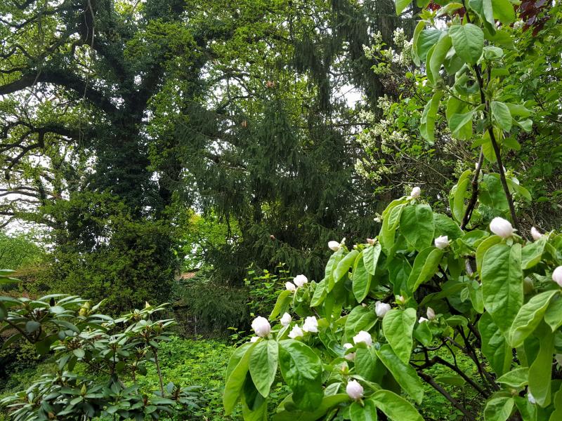 Blühende Apfelquitte, vor geliehener Kulisse ( Eiche vom Nachbarn )