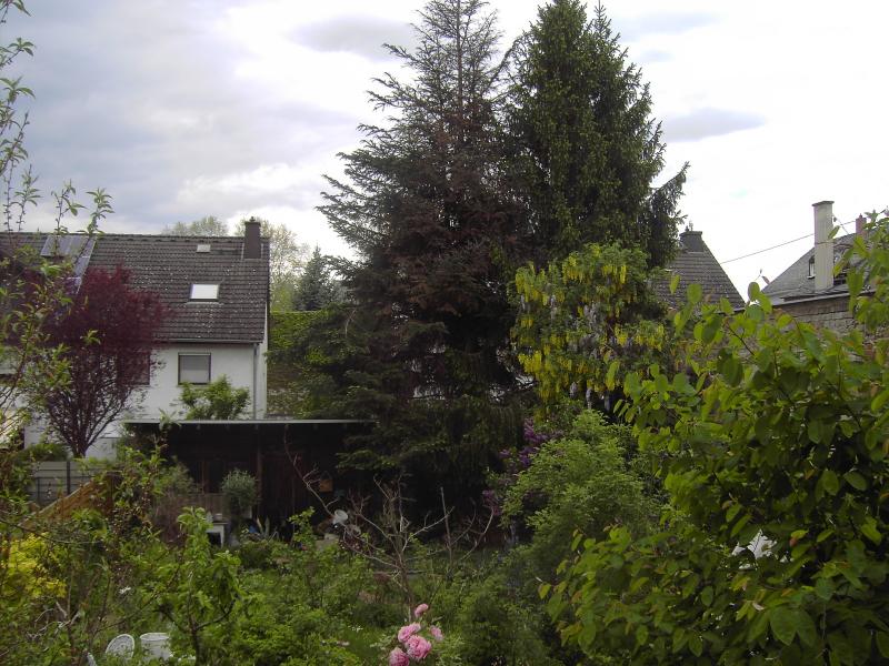 Hier mal ein Foto von meiner Terrasse aus fotografiert auf die sterbende (linke) Fichte.