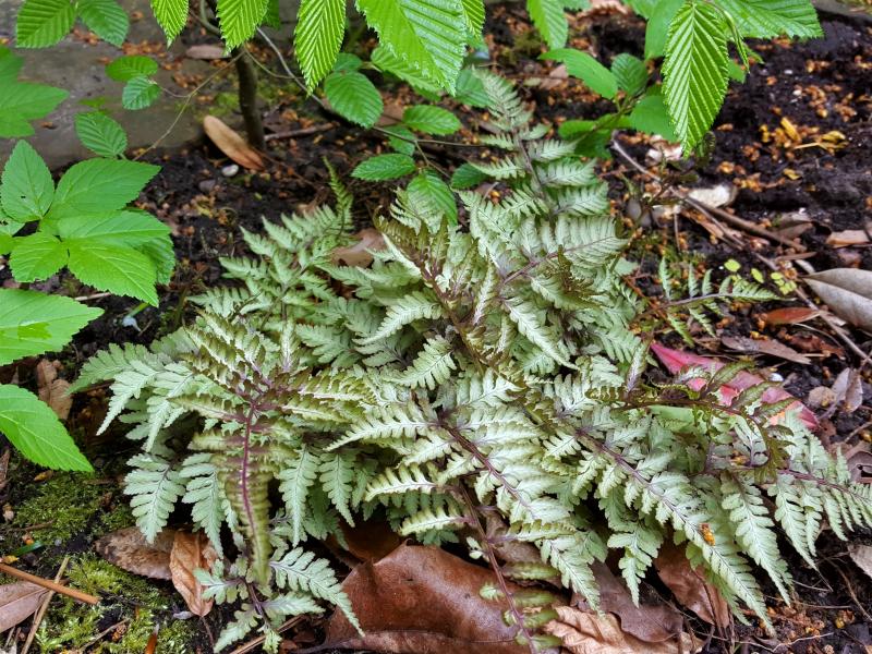 Sehr wahrscheinlich Athyrium nipponicum ‘Pictum’ und Polystichum tsus-simense, übrigens ein sehr üppiges Exemplar davon :D