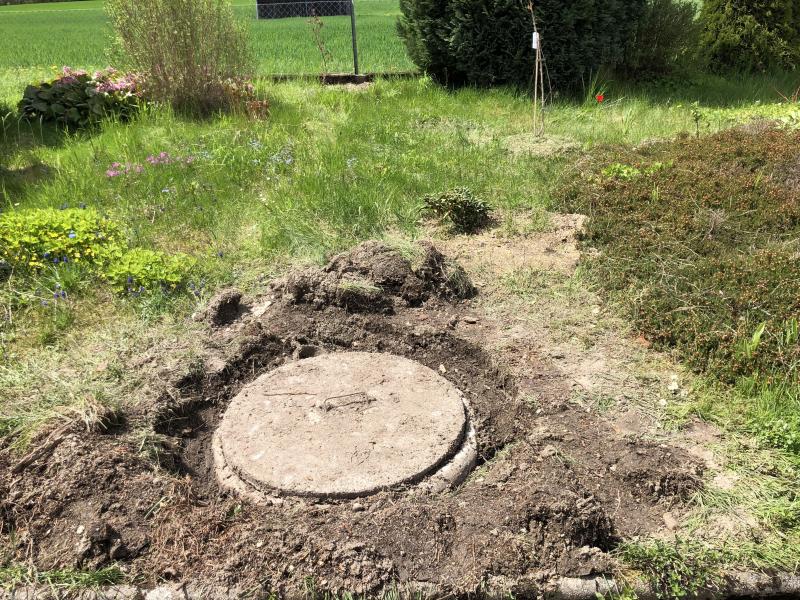 Jetzt kommt gleich eine Firma mit großem Gerät, um unser Abwasserrohr freizuspülen - unter dem Trum, dessentwegen wir vor ein paar Tagen die schöne Eibe im Trog, der direkt auf der Abdeckung stand, fällen mußten.