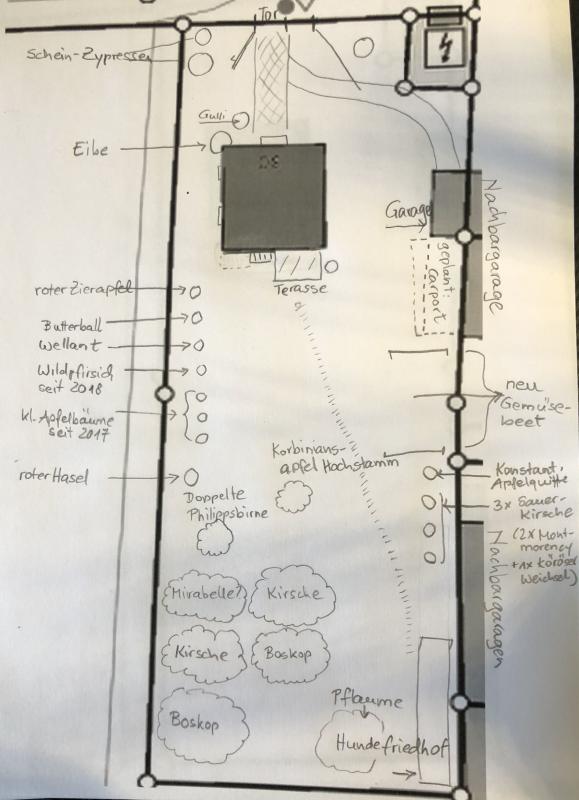 Gerade habe ich anhand des Lageplans (war bei den Kaufunterlagen dabei) versucht, eine grobe Skizze anzufertigen, wo was ist. Gar nicht so einfach. Ich hoffe, man kann was erkennen - auf dem Plan ist Norden oben wie sich das gehört, für mich steht damit alles "verkehrt" herum. Aber vielleicht erkennt man ja was.