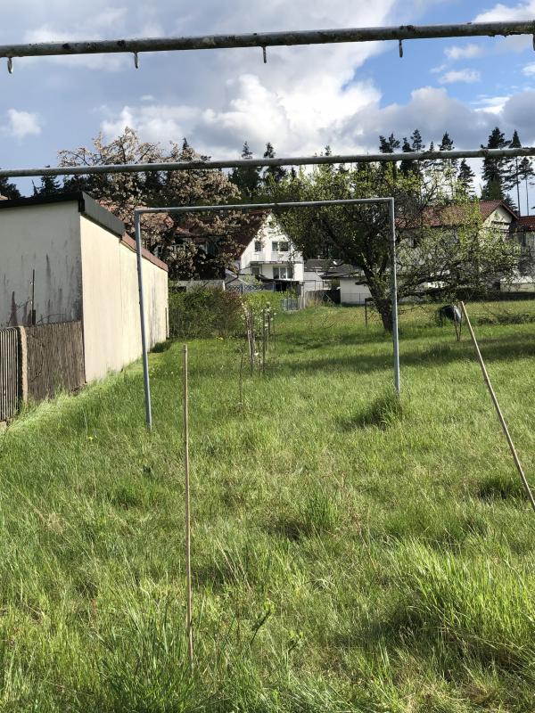 In #39 auf der Skizze habe ich rechts eine Fläche als Gemüsebeet eingezeichnet. Das ist die Fläche zwischen dem Gestänge für die Wäscheleine, die ich nicht nutze. Schön sind die (im Boden einbetonierten) Stangen ja nicht, aber vielleicht kann ich sie irgendwann als Rankhilfen nutzen, deshalb bleiben sie. Vergangenes Jahr hatte ich dort Kulturheidelbeeren gepflanzt, die sind trotz Gießen verdorrt. Lediglich die Missouri-Johannisbeere wächst gut, also werde ich am Kopfteil weitere schwarze Johannisbeeren als Begrenzung setzen. Es wird sicher dauern, bis daraus so ein kleiner Bauerngarten im Garten geworden ist mit niedrigem Holzzaun um die Stangen herum. Aber ich habe ja Zeit, Mitte Juni will ich versuchen, dort Bohnen anzubauen.
