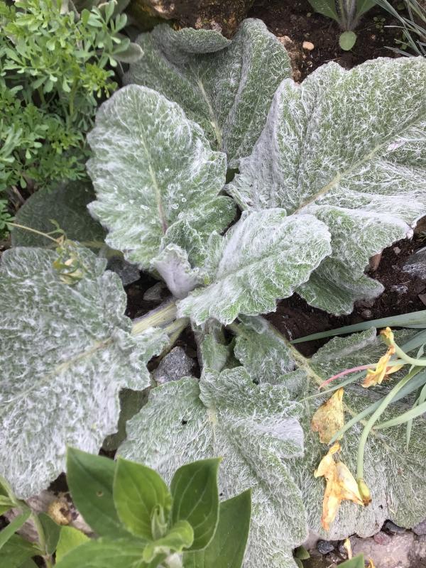 Eine der größeren Gestalten in meinem Steingarten ist der Salbei S. aethiopis. Im Frühling nach der vielen Feuchtigkeit sah er sehr mitgenommen aus. Jetzt scheint er sich langsam aufzurappeln. Die spätere weiße Blüte ist sehr schön und lockt viele Hummeln an. Durch Rückschnitt der verblühten Triebe lebt er meist auch länger als zwei Jahre.
