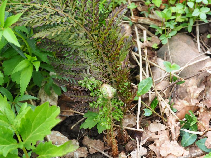 Polystichum setiferum 'Mrs Goffey' neu an geschütztem Standort.