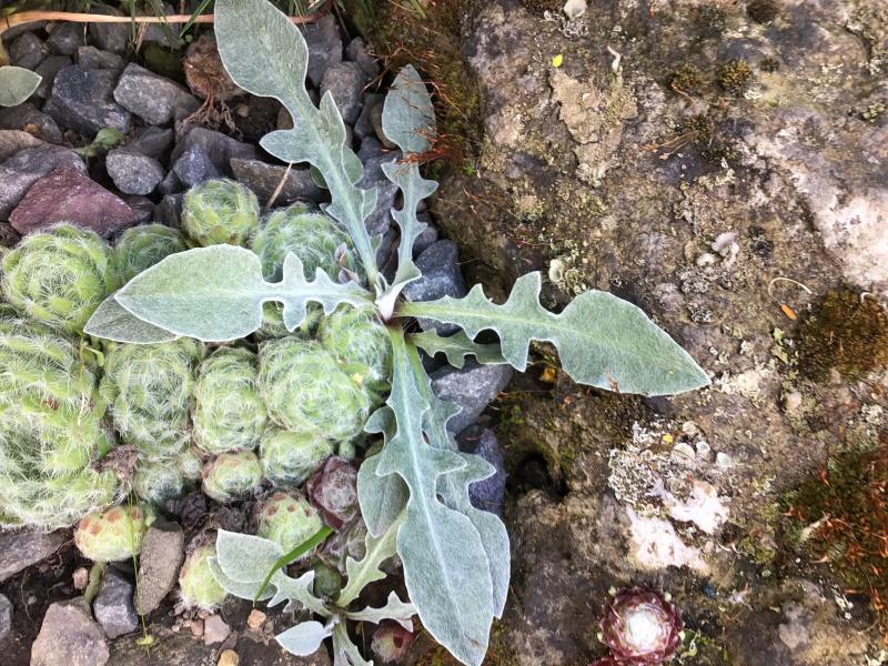 Eine der größeren Gestalten in meinem Steingarten ist der Salbei S. aethiopis. Im Frühling nach der vielen Feuchtigkeit sah er sehr mitgenommen aus. Jetzt scheint er sich langsam aufzurappeln. Die spätere weiße Blüte ist sehr schön und lockt viele Hummeln an. Durch Rückschnitt der verblühten Triebe lebt er meist auch länger als zwei Jahre.