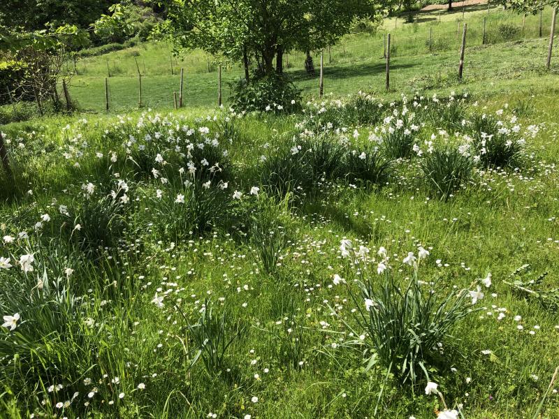 Wetterbedingt ist es zur Zeit leider schwierig, Fotos vom Garten zu machen, nur allzu oft ist es trüb, regnerisch und vor allem stürmisch, so dass mir bestimmte Einblicke, wie z. B. von den Schwertlilien und Dichternarzissen im Vorgarten, einfach nicht gelingen wollen. Heute Vormittag habe ich einen kleinen Rundgang mit der Kamera gemacht und wenigstens ein paar passable Bilder gemacht. Diesmal bin ich zur Haustür 'raus und dann nach unten in den Garten gegangen.