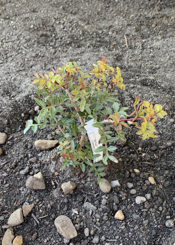 Vor wenigen Stunden gepflanzt: Cistus x argenteus 'Blushing Peggy Sammons', eine der dunkelsten Zistrosen.