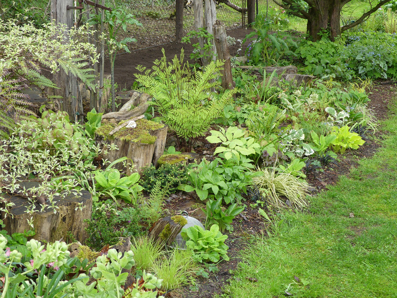Anfangs dominierten in dieser Ecke die Schneeglöckchen und Primeln, gefolgt von den frühen Anemonen. Lathyrus vernus, Eryhtronium und Epimedium. So langsam kommt blütenmäßig etwas Ruhe ins Beet, die Farne und Hosta entfalten sich und es wird im weitern Verlauf eher durch die Laubstrukturen wirken.