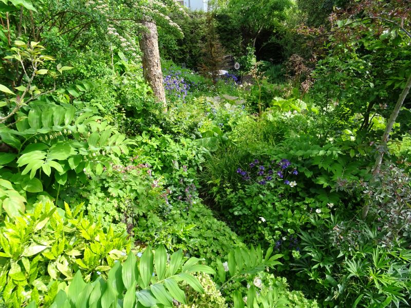 Der "Waldgarten" hat sich mittlerweile sehr schön entwickelt und wird langsam dicht. Im Mai/Juni ist er mit der Blüte von Salomonsiegel, Storchschnabel, Hasenglöckchen, Schaumblüte und Silbertaler definitiv auf seinem Höhepunkt. Auch die Farne kommen nun langsam in die Gänge, ich dachte schon, sie würden gar nicht mehr austreiben. Auf jeden Fall muss ich hier noch ein paar Samen von Vergissmeinnicht und Akeleien ausstreuen.