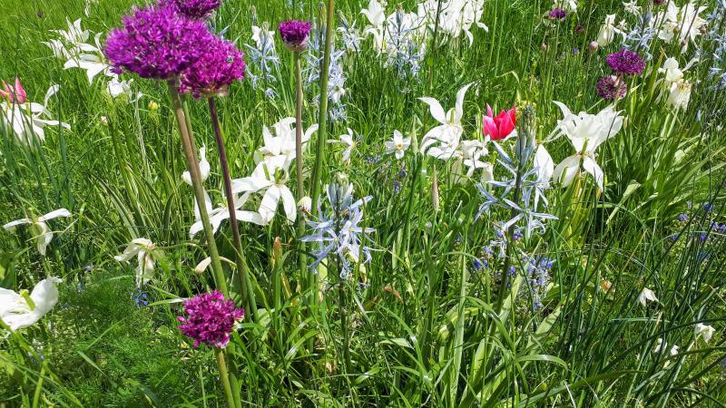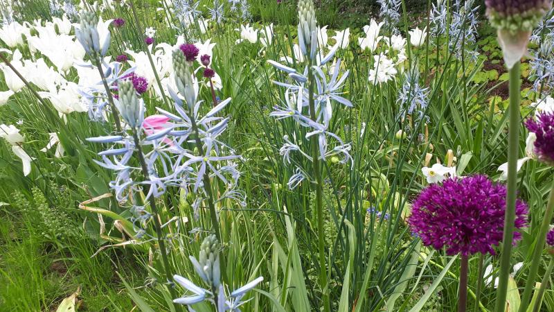 Dunkelblaue Camassia, wunderbar cremefarbene Tulpen mit zart errötenden Wangen, Dichternarcissen, Purpurlauch...