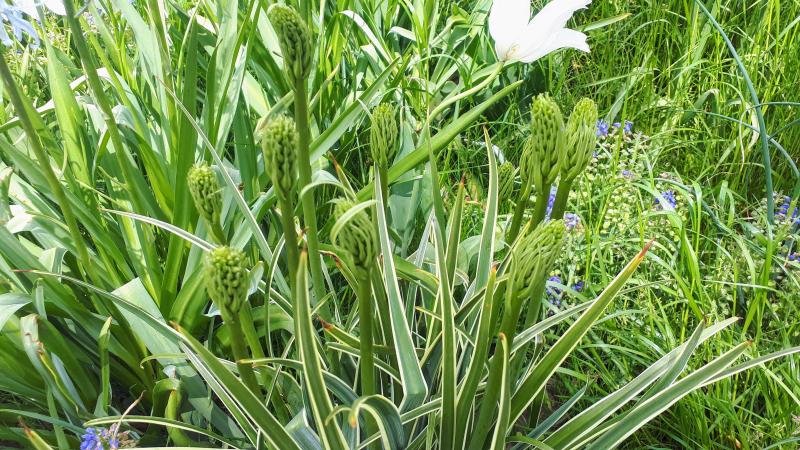 Ich wußte nicht, daß es Camassia mit gelb gestreiften Blättern gibt! :o Noch nie gesehen... und hier noch in Knospe. ;D