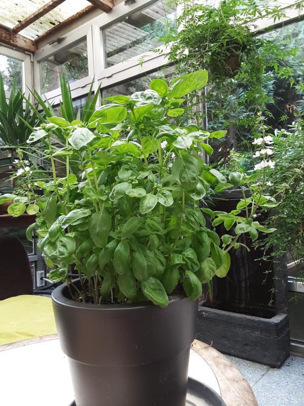 Hier mal ein aktuelles Bild von meinem Basilikum aus dem Supermarkt, hatte es in Lechuzza umgetopft, angegossen und draußen stehen lassen. Vor ein paar Tagen habe ich es in den Wintergarten gestellt da es hier ständig regnet.