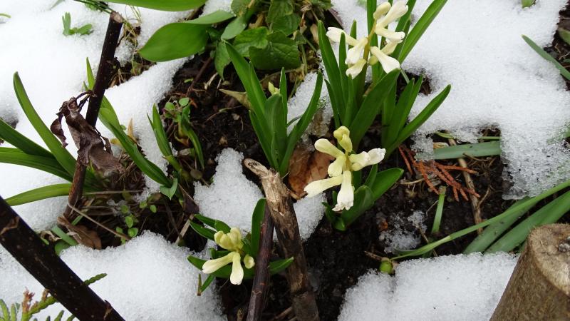 Roman Hyacinth (Hyancinthus orientalis var. albulus) schieben sich durch die kleine Schneedecke und es sind viel mehr geworden. Mal sehen ob sich auch die blauen noch zeigen.