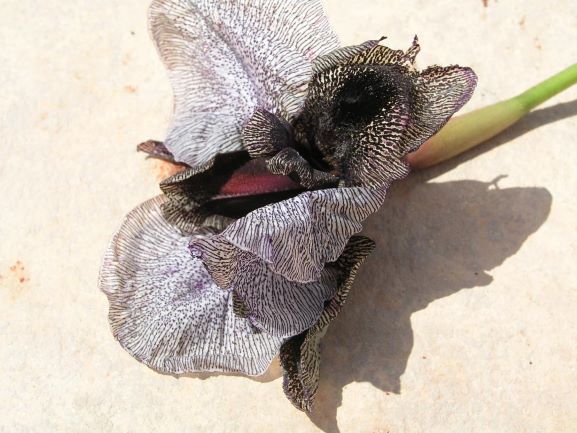 Auf alle Fälle eine Oncocyclus-Iris. Von denen gibt's allerdings ein paar Dutzend Arten im Nahen Osten. Sieht primär nach Iris kirkwoodiae aus, aber es könnte auch was anderes sein – ich hab' nicht alle Arten vor dem geistigen Auge, und von diversen raren, die z.B. in Syrien nur sehr eng begrenzte Vorkommen haben (bzw. hatten – man weiß ja nie, was da nach ein paar Jahrzehnten Bürgerkrieg noch übrig ist :-X), kenne ich die Optik nicht und kann nicht einschätzen, wer da noch in Frage käme. Aber I. kirkwoodiae wäre schon mal ein heißer Kandidat.