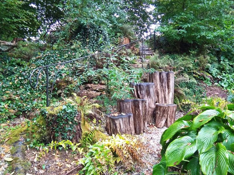 Zum Beginn verteilte einige Trittsteine zur besseren Begehbarkeit. Nach einigen Jahren mit zunehmenden Alter musste ich feststellen, dass dies nicht die Lösung ist, wenn man auch noch als Rentner hier arbeiten will. Ich habe also mit Stufen und Wegen begonnen. Diese sollten sich möglichst harmonisch einfügen. Ich hoffte dass sie sich nach und nach von selbst begrünen.
