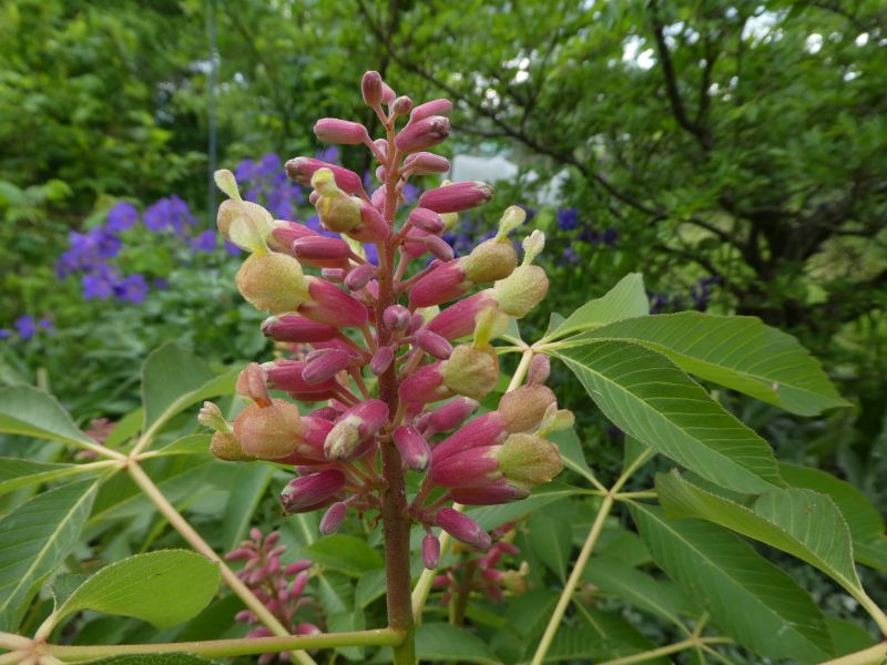 Hier ist Aesculus pavia am Aufblühen. Eine Steinhummel fand das ganz toll und zwängte sich in die Blüte. Dort blieb sie lange stecken. Ich begann schon, mir Sorgen zu machen. ;D Irgendwann tauchte sie auf, Rüsselchen ganz lang gezogen und säuberte sich lange und ausgiebig, nur um gleich die nächste Blüte anzufliegen. Bis ich die Kamera holen konnte, war sie aber leider weg.