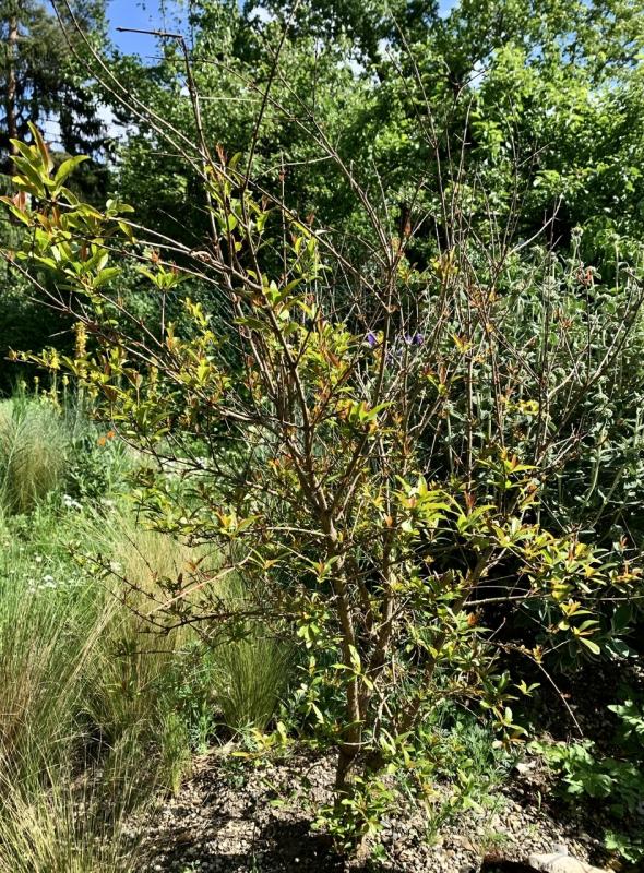Beim zweiten ausgepflanzten Punica, Agat, haben die Rückschläge des Winters mehr Spuren hinterlassen, obwohl er weniger im Windkanal steht und vom Haus nach N geschützt ist. Mehrere Zweige sind trocken, in der Vegetation ist er 2-3 Wochen hinter dem anderen.