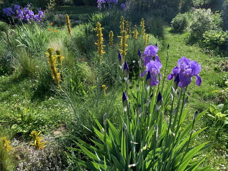 Spät dieses Jahr, aber doch: gemeinsame Blüte von Iris Pallida und Asphodeline lutea (und beginnend auch der kalif. Mohn)