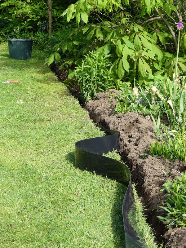 Ich habe heute den Rasen gemäht, die erste Beetkante für dieses Jahr gestochen und dann auch direkt die neue Kunststoff-Beetkante gesetzt. Der gut durchfeuchtete Boden erleichtet es, einen schmalen Graben dafür auszuheben (mit der Pflanzschaufel). Ca. 25 m sind geschafft.