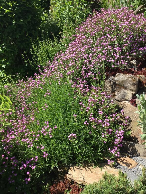 Saponaria ocymoides hat nur auf Sonne gewartet und ist voll aufgeblüht. Leider etwas expansiv. Der Lavendel, den ich im letzten Sommer sehr ins alte Holz zurückgeschnitten hatte, muss etwas kämpfen.