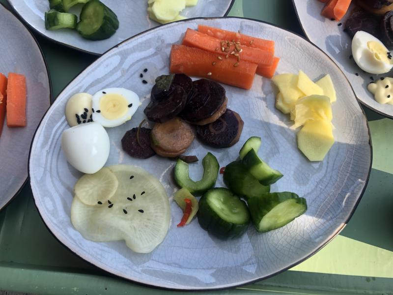 Gestern gab es zum Aperitif ein paar japanische Pickles mit Wachtelei und danach gut belegte Hamburger. :D