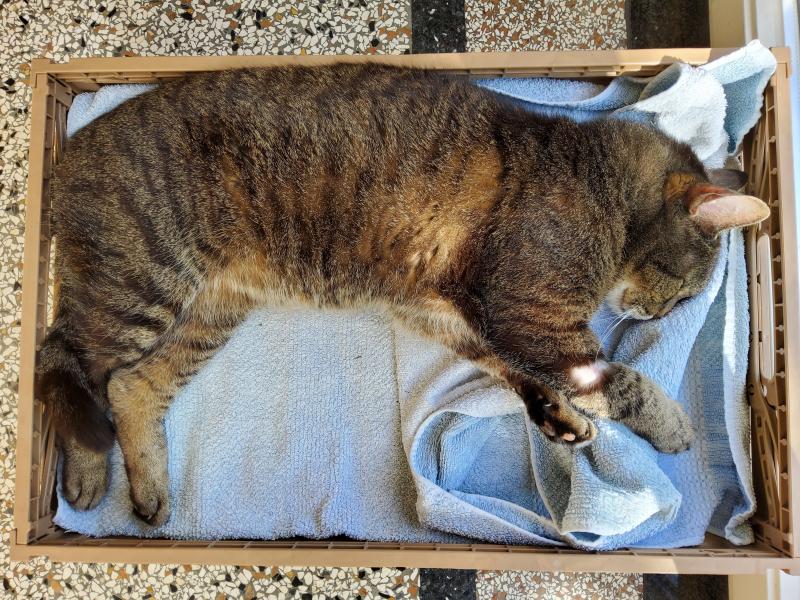 Dem geht es gerade gut, diese Kiste wird sehr geliebt! Die kahle Stelle am Bein ist von der letzten Blutuntersuchung, alles ok.
