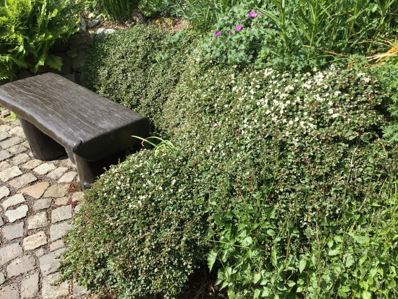 Mein Sitzplatz am Teich. Die Trockenmauer im Rücken ist nun von der Felsenmispel völlig überwachsen. In den letzten Jahren muss ich sie ständig zurückschneiden, damit sie nicht noch mehr Platz erobert.