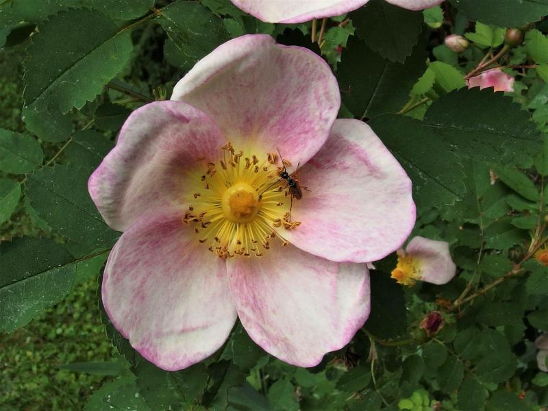 Rosa glauca "Nova" beginnt zu blühen.