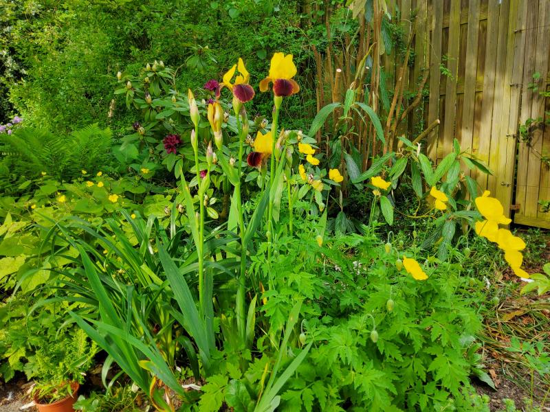 diese Iris ist nicht besonders schön, aber sie blüht im Halbschatten immer noch recht gut und passt farblich einfach toll zu Rhodo, Mohn und Saruma