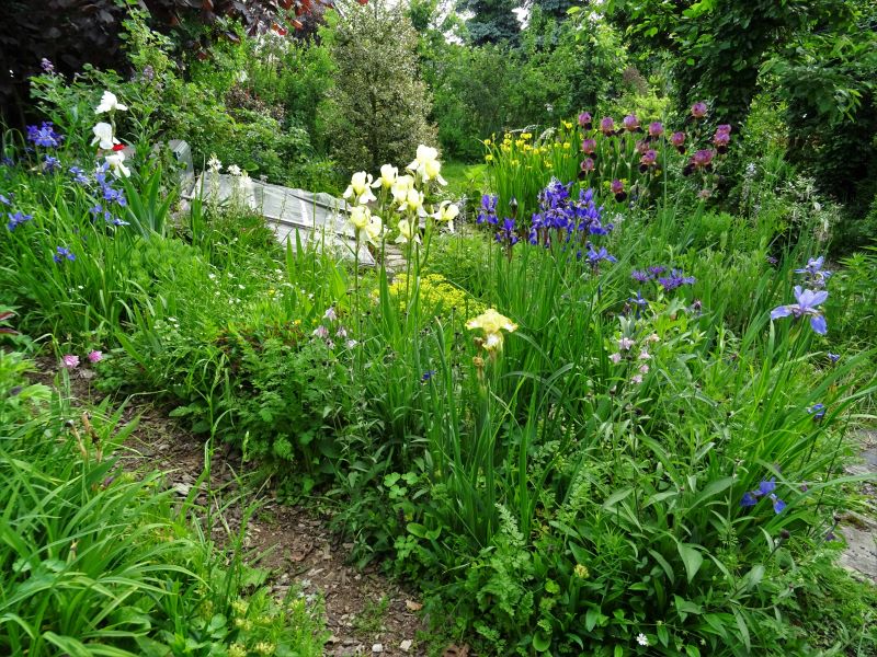 Da mich vor allem im vergangenen Jahr die Wasserträgerei ziemlich nervte, stehen an dieser Stelle jetzt weitere Iris und sonstige Gewächse von eher robustem Gemüt. Die Blütezeit aufs Jahr gesehen wanderte dadurch mehr nach vorne und hinten (so ein üppiges Frühjahrsbild hatte ich sonst nicht) und ich erwarte mir davon auch eine entspanntere Sommerpause.