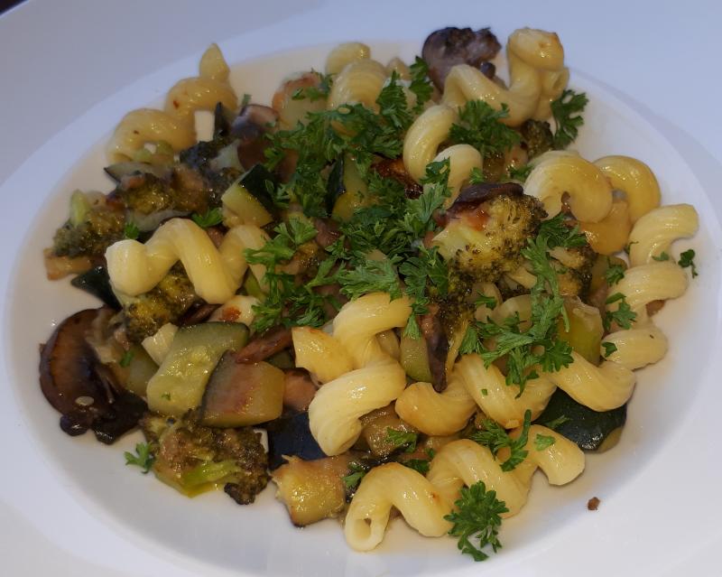Pasta mit gebratenem Brokkoli, Zucchini und Champignons, Parmesan