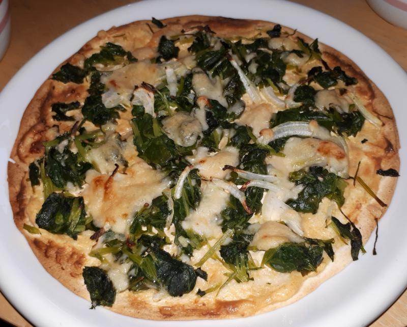 Nochmals Dürüm- Flammkuchen mit frischem Gartenspinat, Zwiebeln und gehobeltem Parmesan, Pak choi-Salat mit Tomaten