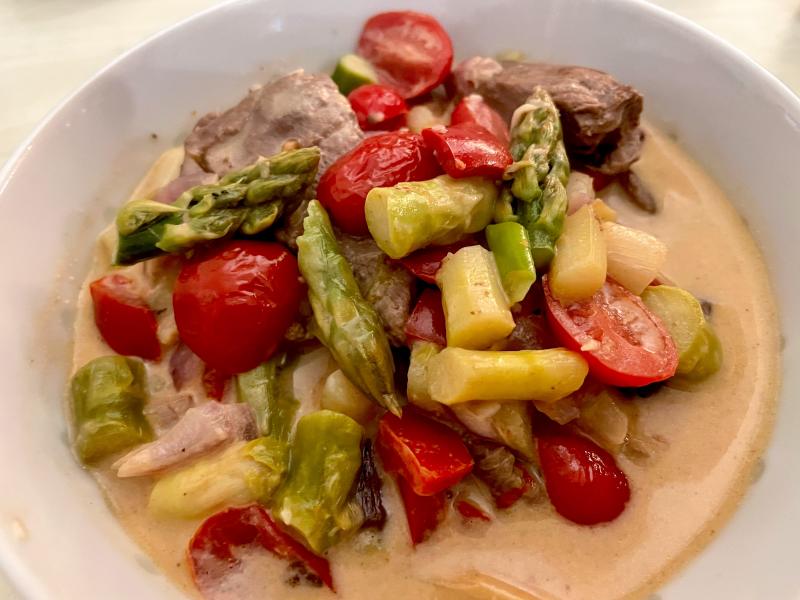 rotes thai-curry mit zartwürzigem biorindfleisch (oberschale) und gartenspargel