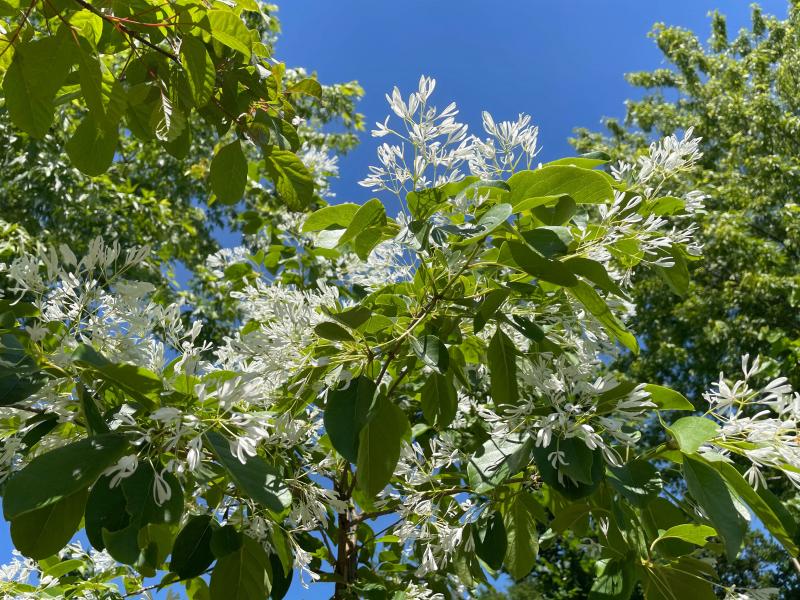 Im Prinzip ist Chionanthus virginicus zur Blüte schon auffällig, hier im Schatten einer großen Hängebuche kaum.
