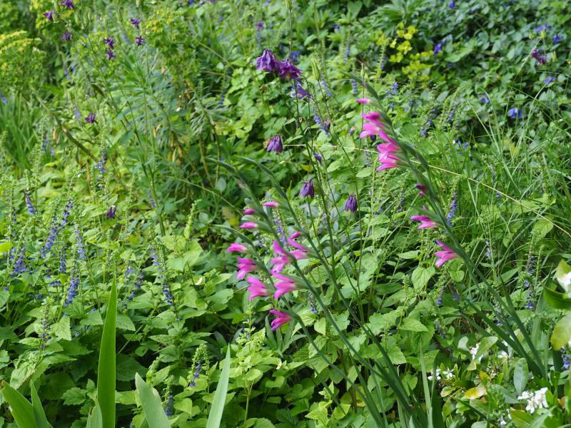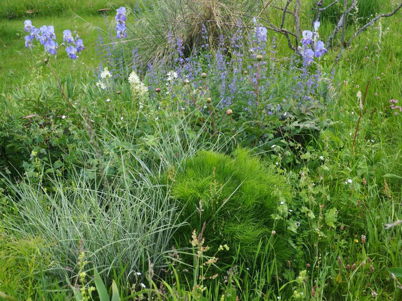 Schwertlilien, Haarstrang und Morninglight, dazwischen Camasiia leichtlinii Alba.