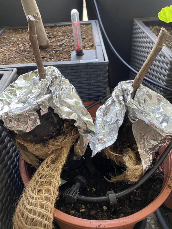 Dieses Mal 2cm Rinde entfernt und Bewurzelungspulver (Kawizda) verwendet mit normaler vorgemischter Erde, in die auch meine anderen Feigen gepflanzt werden.