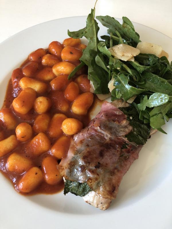 Gegessen wird trotzdem. Am Donnerstag gab es Saltimbocca, Gnocchi in Tomatensoße und Rucola mit Parmesanspänen. Sehr lecker! Salbei und Rucola waren frisch aus dem Garten :)