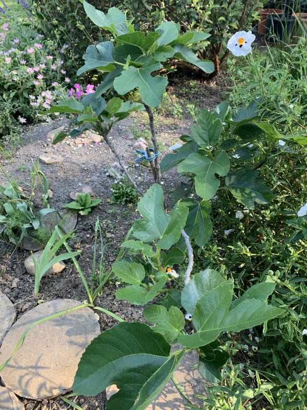 Die ausgepflanzte Dottato (Pflanzung 9/18) kommt im Herbst in den Topf zurück, sie wird bereits von einer Zistrose bedrängt. Der Standort hat sich als ungünstig erwiesen (ausreichend Sonne nur bis Anfang August, danach zu viel Beschattung durch riesige Bäume im Nachbargarten). Kosten konnte ich noch nichts, letztes Jahr im feuchten Sommer gab's eine faule Breba, 2 sind jetzt dran.