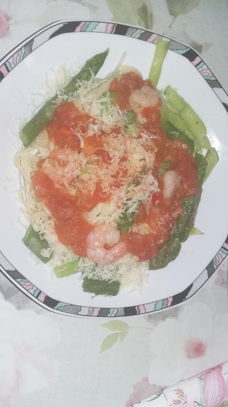 Spaghetti mit Tomaten, grünem Spargel, Garnelen und Parmesan.