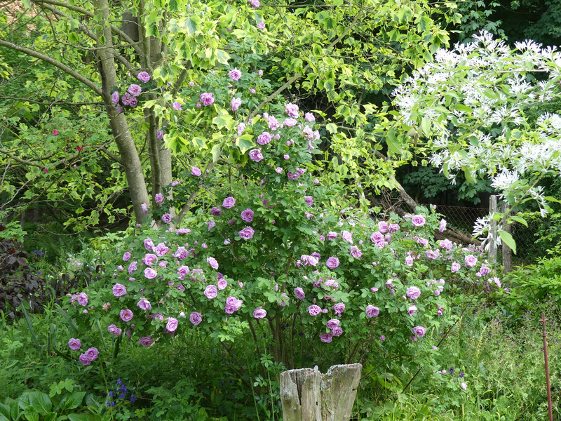 Hier blühen schon seit einigen Tagen die ersten Rosen. 'Dresdner Barock', 'Therese Bugnet', R. moyesii. 'Utopia', 'Stanwell Perpetual', ... und 'Wasagaming', die inzwischen mehr als 2 m hoch ist und eine herrliche Duftwolke in den Garten stellt.
