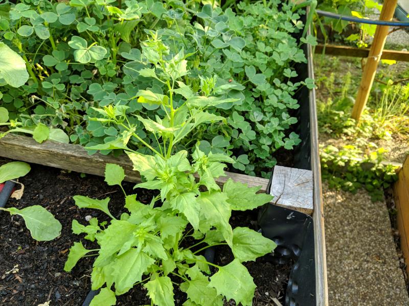 So gefällt es mir. Bunte Rote Rüben, Markerbsen, Kartoffeln im vorderen Beet, Karotten und diverse Kohlgewächse im hinteren Beet.