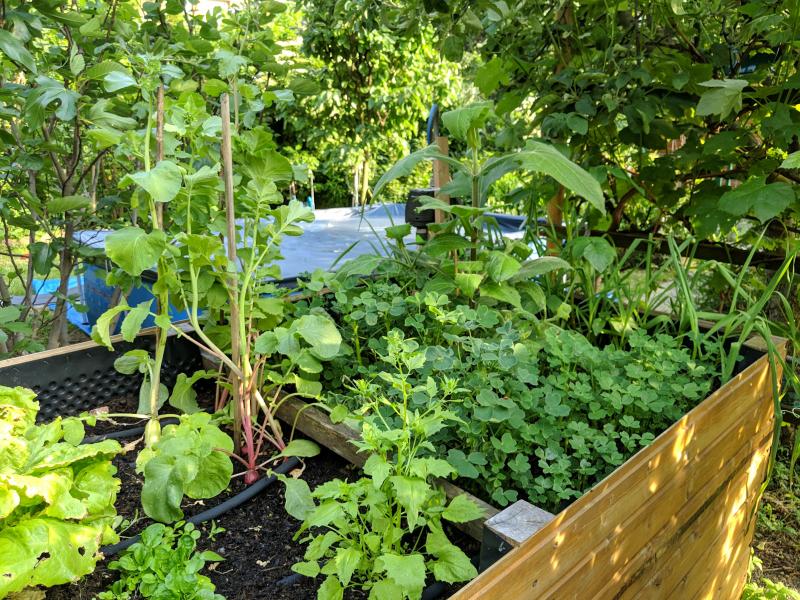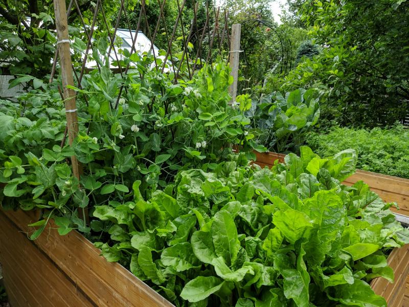 So gefällt es mir. Bunte Rote Rüben, Markerbsen, Kartoffeln im vorderen Beet, Karotten und diverse Kohlgewächse im hinteren Beet.