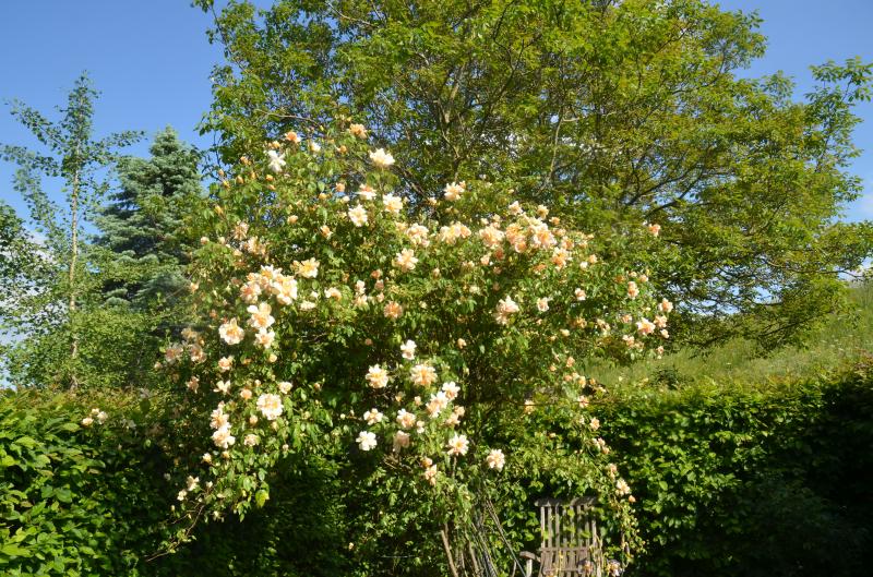 Crepuscule, war mal ein "Verreckerling". Ihre beiden Schwestern wurde am Pavillon der Winter 2012 zum Verhängnis, (da wo nun der weisse regen drüberhängt ;D). aber sie hat überlebt und drückt nun durch die Blütenlast den Obelisken auf die Seite
