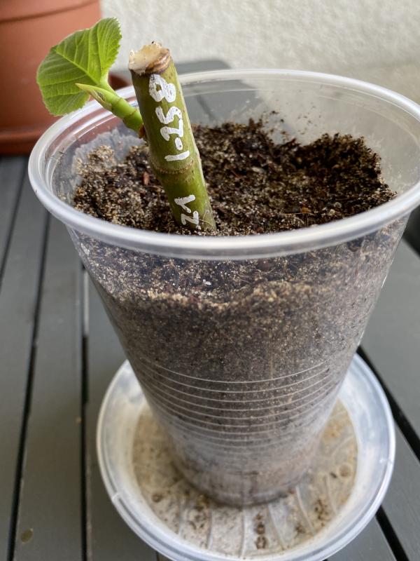 Hier der halbgrüne I-258 Steckling auf den der Feigenhof wartet. Wurde vom der im Dezember 2020 bewurzelten Stecklingspflanze (Achilles Feigen) im Mai geschnitten. Die war damals bereits von 8cm auf 80cm gewachsen in 4 Monaten mit Growlight von 6-22 Uhr.